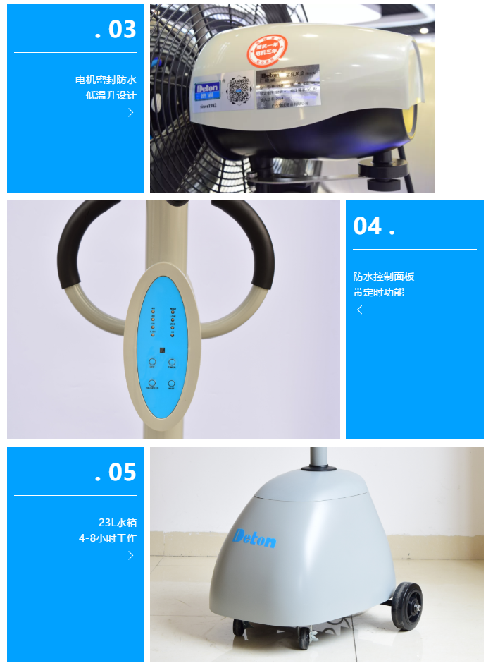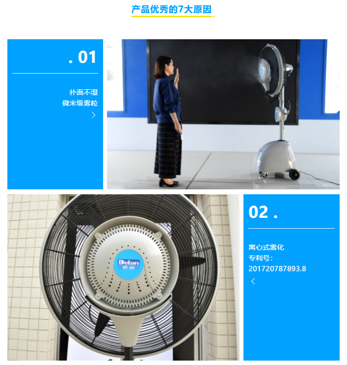 ● 德通霧化降溫風扇,通過離心式霧化,將水珠打散成微米級直徑的細膩霧粒,增大與空氣的接觸面積,通過水分蒸發帶走空氣中大部分熱量,從而達到降溫的效果。
