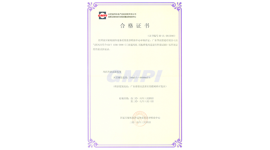 廣東肇慶德通有限公司實驗室持續符合GB/T1236-2000《工業通風機 用標準化風道進行性能試驗》的標準規定的性能試驗要求,續頒合格證書!...